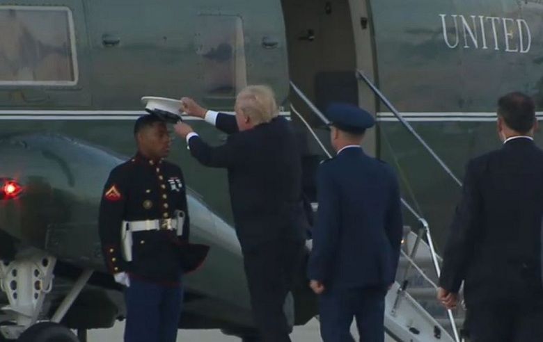 Трамп подходил к борту вертолета Корпуса морской пехоты США, когда увидел, что у одного из морских пехотинцев ветер сорвал с головы форменную фуражку. Морпех по регламенту оставался неподвижным и держал руки по швам.