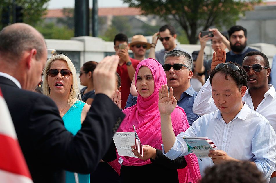Настоящим я клятвенно заверяю, что я абсолютно и полностью отрекаюсь от верности и преданности любому иностранному монарху, властителю, государству или суверенной власти, подданным или гражданином которого я являлся до этого дня;что я буду поддерживать и защищать Конституцию и законы Соединенных Штатов Америки от всех врагов, внешних и внутренних; что я буду верой и правдой служить Соединенным Штатам; что я с оружием в руках буду сражаться на стороне Соединенных Штатов, когда я буду обязан сделать это по закону; что я буду нести нестроевую службу в вооруженных силах США, когда я буду обязан делать это по закону; что я буду выполнять гражданскую работу, когда я буду обязан делать это по закону; и что я приношу эту присягу открыто, без задних мыслей или намерения уклониться от ее исполнения. Да поможет мне Бог. |