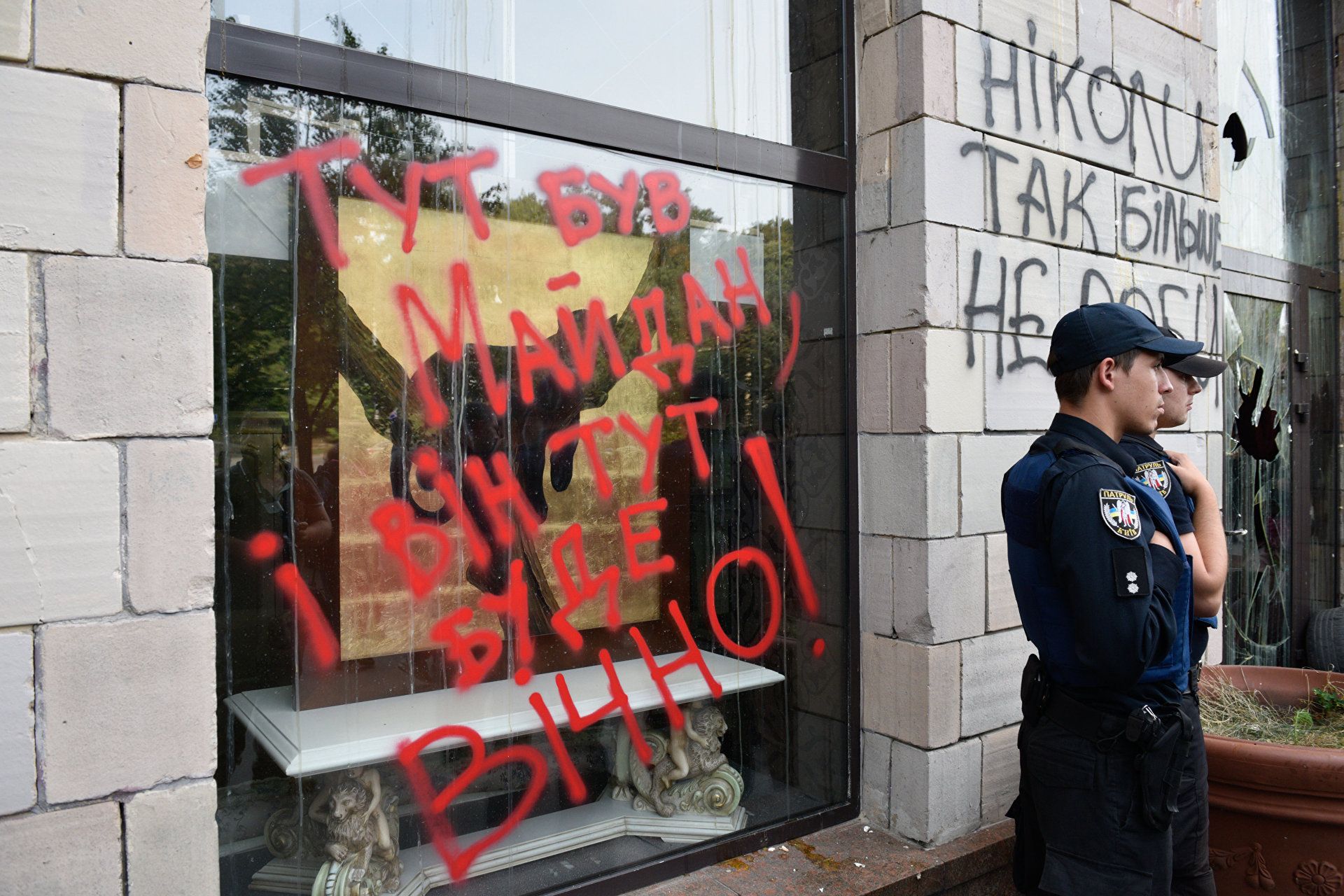 Да, так вот. На здании этом несколько лет назад появилось патриотическое граффити. Майдан-2013 вообще открыл в украинцах невиданные ранее залежи креатива. Украинцы помнят мощную волну перекрашивания всех свободных и занятых поверхностей в цвета национального прапора. Начинали с мостов и заборов, потом, как говорится, доработались до мышей и красили уже мусорные контейнеры, урны и общественные туалеты. Повсюду стояли патриотические дивчины и парубки, гордо клянчившие «на фарбу» (то есть на краску), как у нас умеют — вежливо, но со скрытой угрозой.