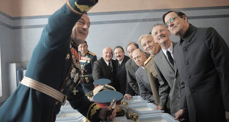 Вначале — о самом фильме. Никакого отношения к советской России он, безусловно, не имеет. Это комикс черного юмора, снятый по комиксу же и оформленный в декорациях «рашен тоталитаризм однажды в двадцатом веке стайл». То есть очень много красных звезд, налепленных на все. Очень много парадных кителей и мундиров, дубовых дверей, портретов и красных тяжелых занавесей. Очень много зимы и русского снега. И множество британских и американских лицедеев, условно изображающих отечественных исторических деятелей.