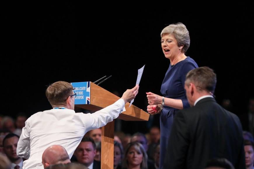 Британский пранкер Саймон Бродкин прервал выступление премьер-министра Терезы Мэй, вручив ей форму для увольнения P45, пишет Telegraph.
