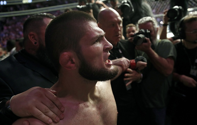 Нурмагомедов набросился на одного из членов команды соперника после окончания поединка, что спровоцировало массовую драку в зале и в октагоне. Россиянин выругался на Макгрегора, в ярости прошел по октагону и указал пальцем на одного из членов команды ирландца. Затем Нурмагомедов перепрыгнул через сетку и подрался с ним.