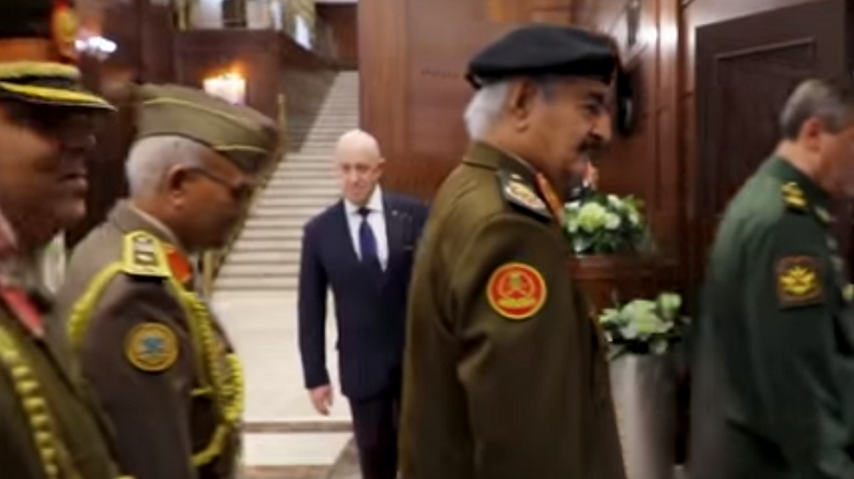Пресс-служба Ливийской национальной армии опубликовала ролик, в котором верховный главнокомандующий Халиф Хафтар прибыл на переговоры с министром обороны России Сергеем Шойгу; на переговорах камеры запечатлели российского бизнесмена Евгения Пригожина.