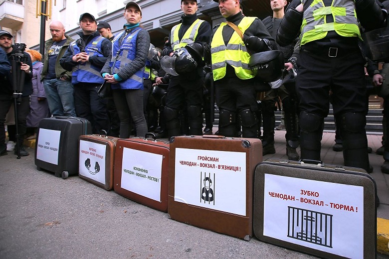 Представители националистического движения «Национальные дружины» и партии «Национальный корпус» принесли к зданию администрации президента Украины чемоданы для Петра Порошенко и членов правительства, передает корреспондент РИА Новости.