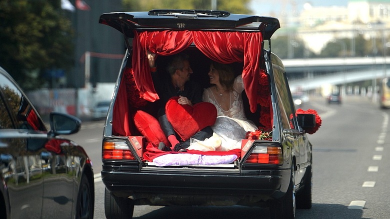И какой способ для того они выбрали? Поехали в церковь на катафалке — «Пока смерть не разлучит нас». Чёрный юмор, да. Но и венчание, проходившее в храме, — тоже своего рода чёрный юмор, а вернее — кощунство и издевательство.