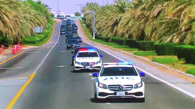 Путин во вторник прибыл официальную встречу наследным принцем Абу-Даби Мухаммедом бен Заид Аль-Нахайяном на автомобиле Aurus. На подъезде ко дворцу кортеж президента России сопровождали автомобили Mercedes белого цвета с эмиратскими номерами и выполненной синим цветом надписью «ДПС». На дверцах машин были нарисованы флаги и гербы двух стран.