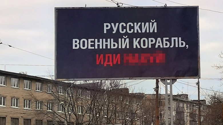 В общем, слишком многое указывает на то, что эта поделка в спешке клепалась 24 февраля какими-то безвестными героями информационного фронта. Конечно, склепать и разогнать как раз получилось. Вскоре мемом с РВК были заполнены украинские рекламные площади (баннеры, борды и даже экраны). РВК появился на бегущих строках в общественном транспорте. Дальше РВК пошел через границы – особенно в Прибалтику, где пока еще помнят русский язык. А для более дальнего зарубежья мем перевели на английский язык.